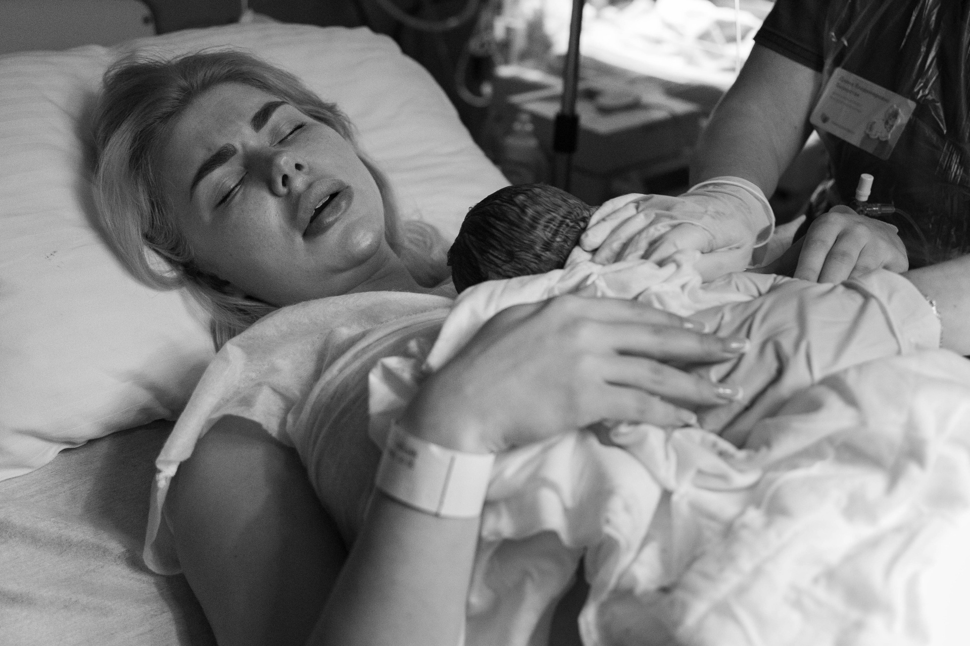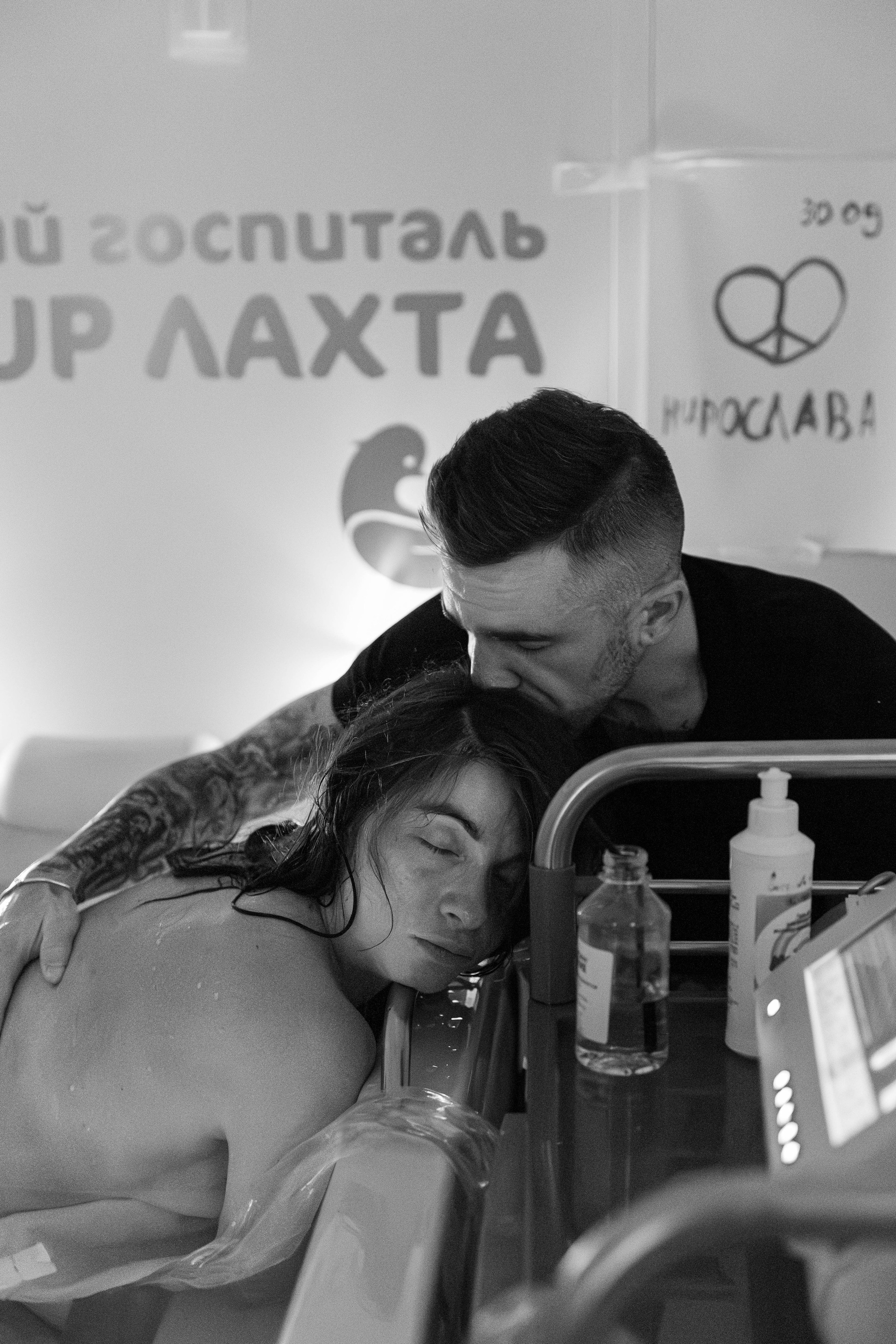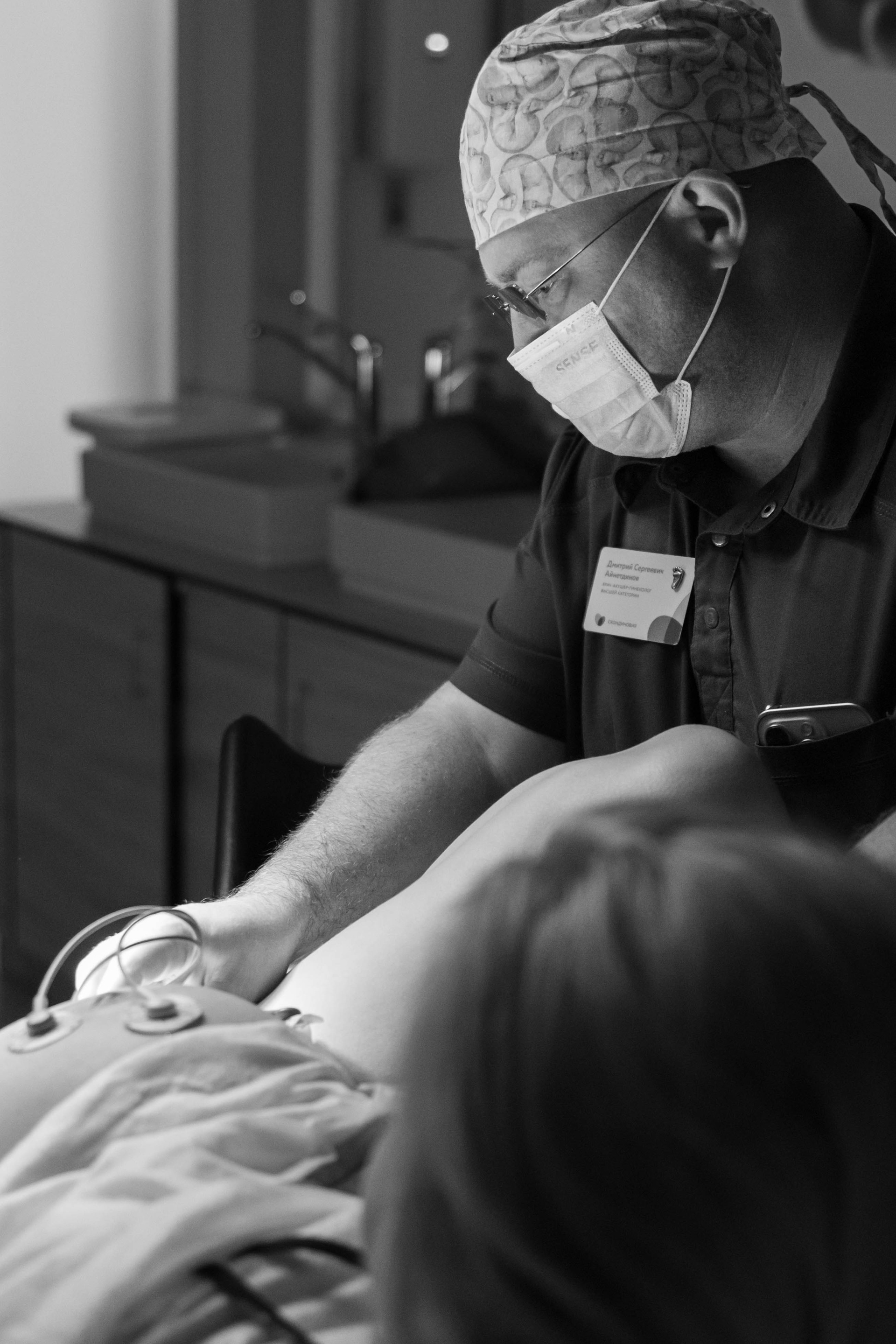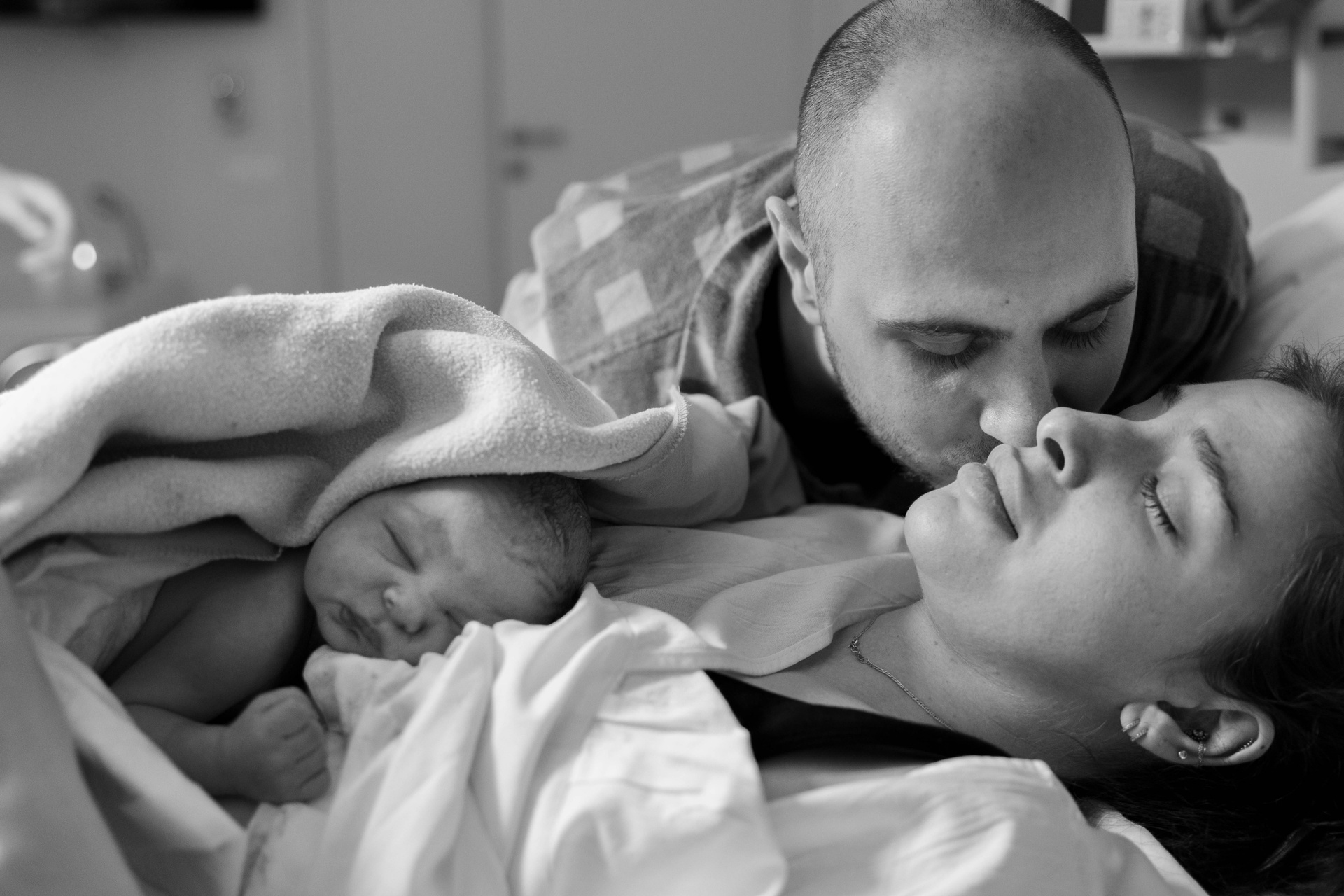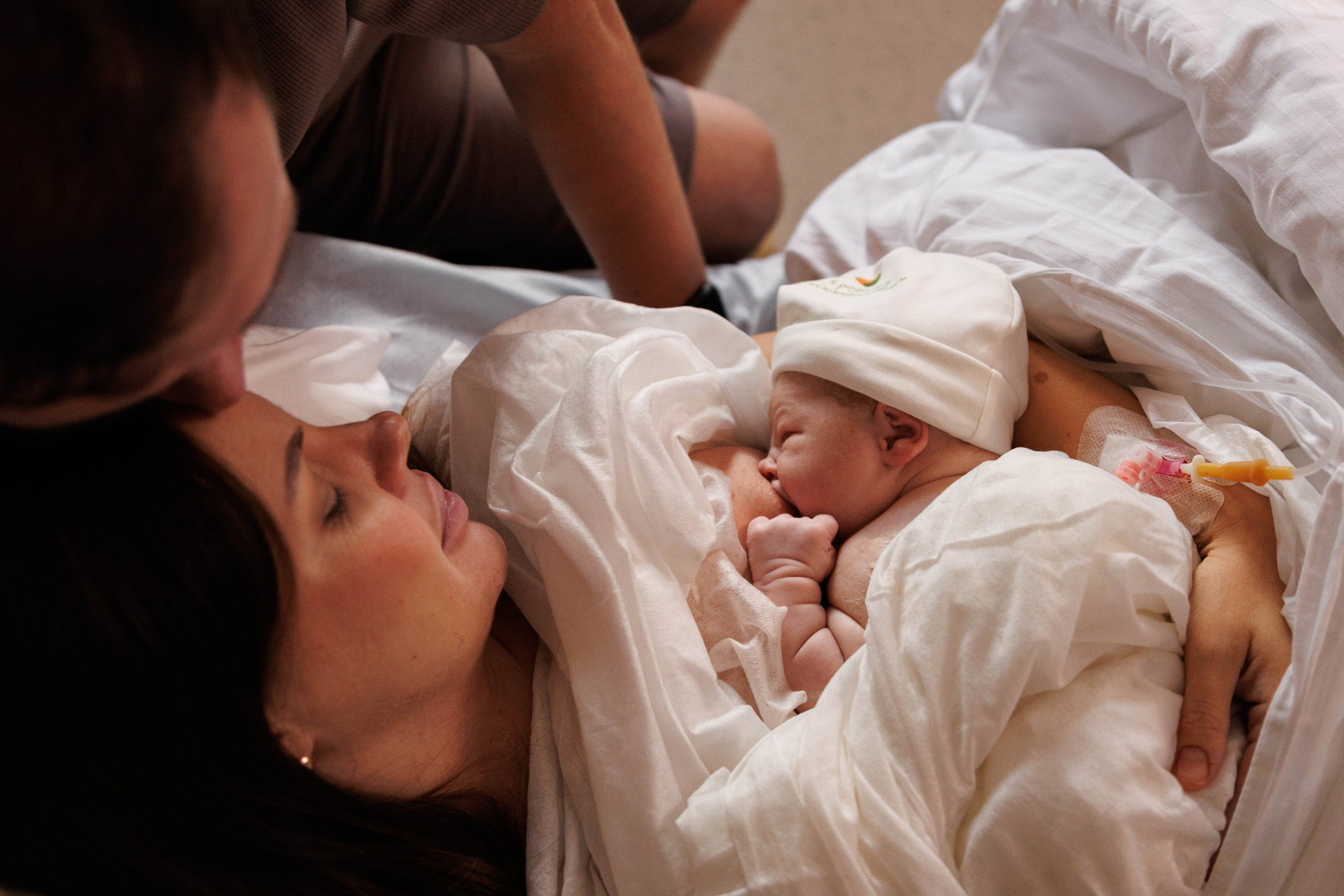 Вот он, самый главный кадр — момент первой встречи. Широкие, полные изумления глаза мамы, впервые видящие свое дитя, слезы счастья, поцелуи, первый вздох малыша, общий для троих.