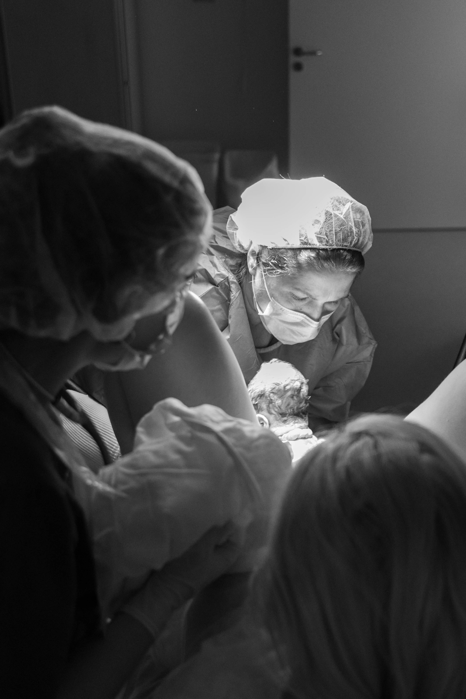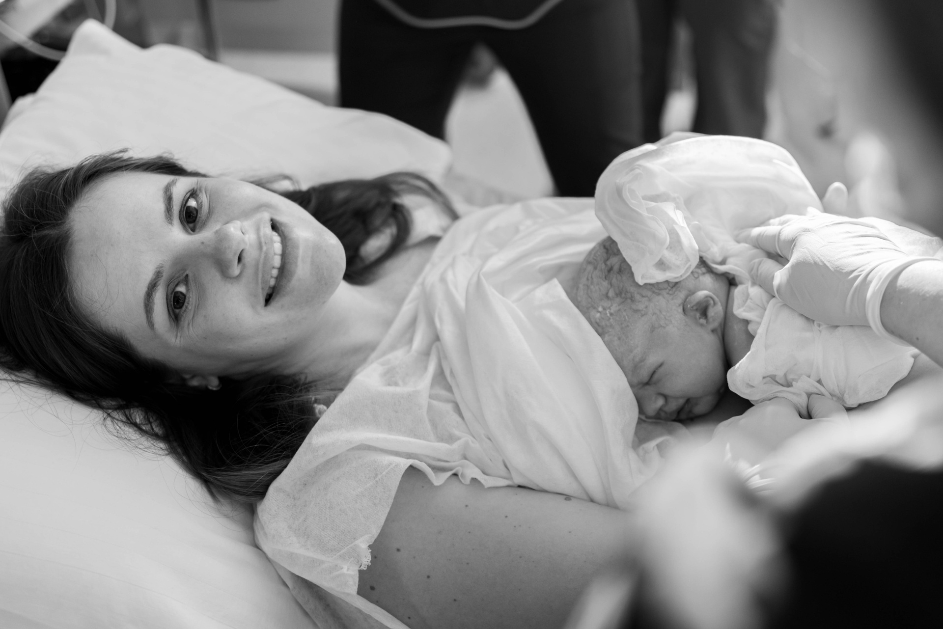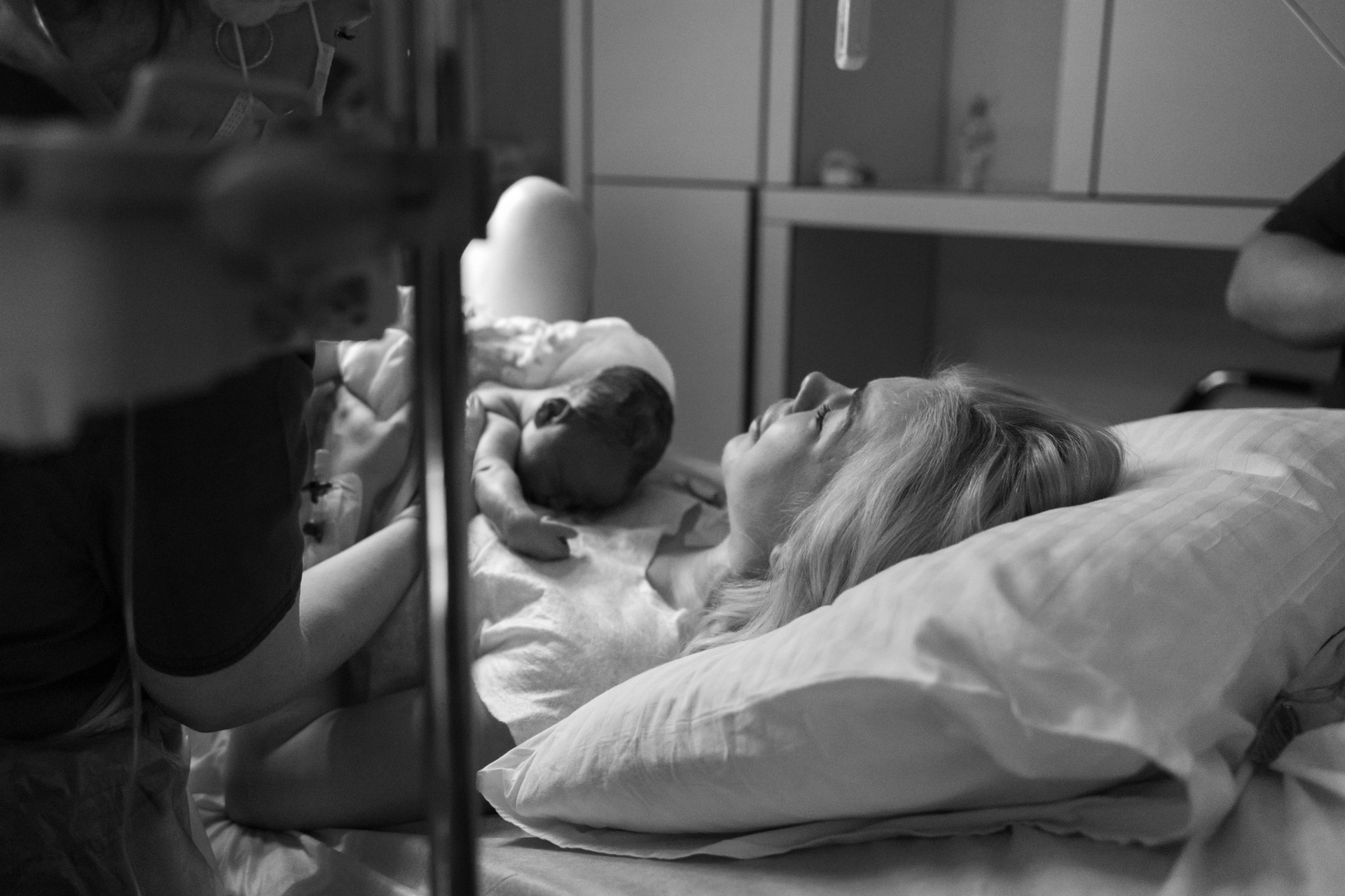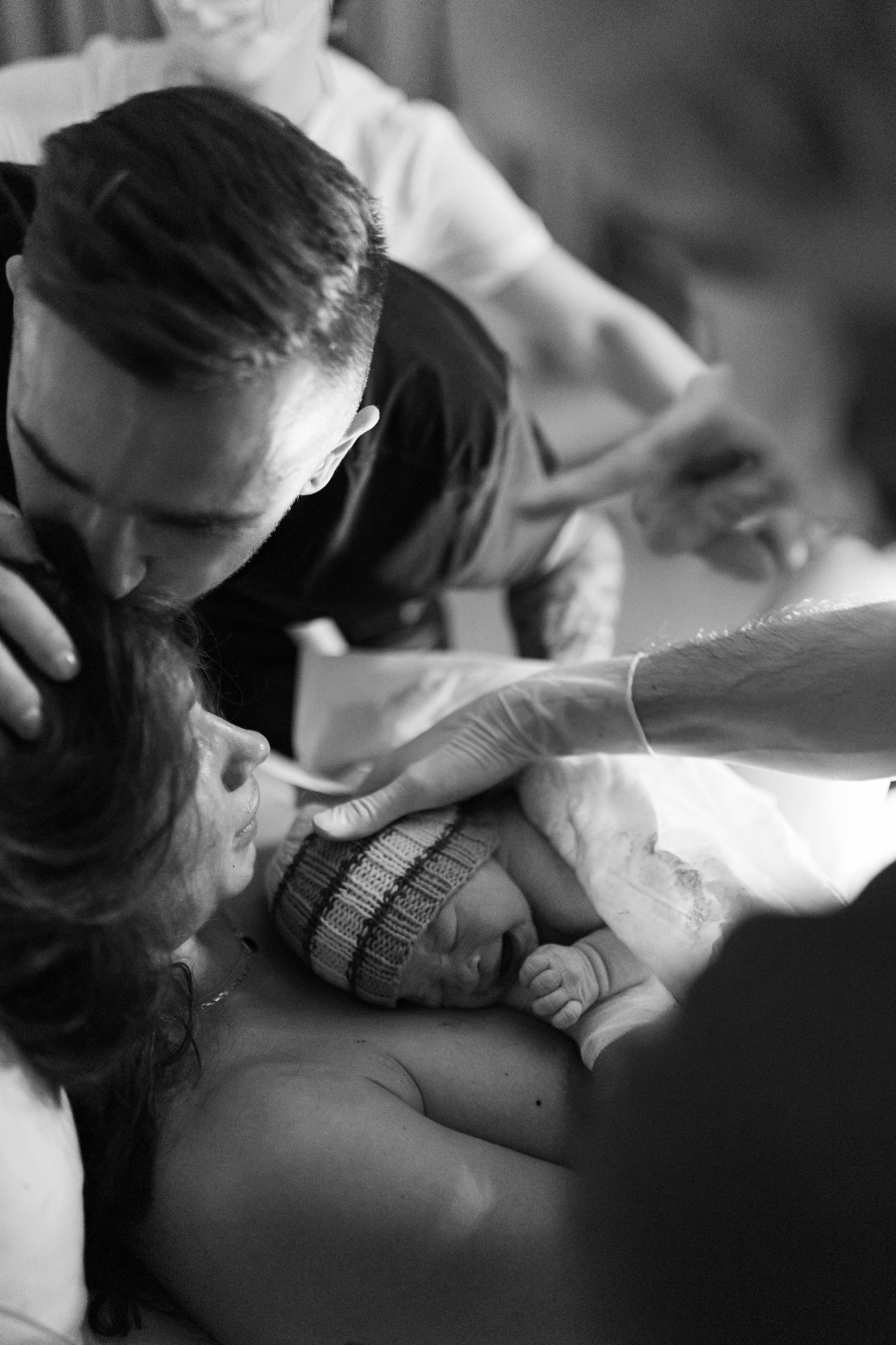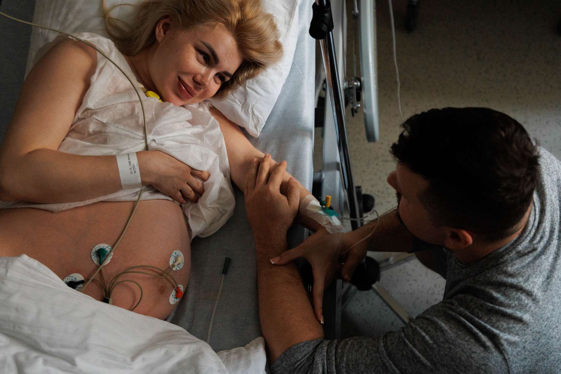Вот он, самый главный кадр — момент первой встречи. Широкие, полные изумления глаза мамы, впервые видящие свое дитя, слезы счастья, поцелуи, первый вздох малыша, общий для троих.